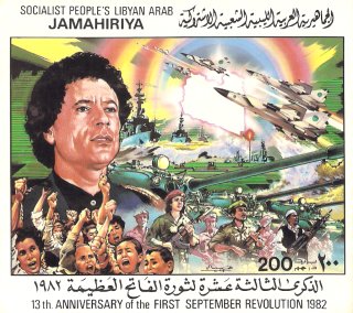 Pierwszy znaczek został wydany w 1982 r., w 13. rocznicę puczu, określanego oficjalnie jako Rewolucja 1 Września. Znaczek przedstawia niejako w pigułce Libię pod rządami Kaddafiego z bogactwem w postaci ropy naftowej, ambitnymi przedsięwzięciami w zakresie rolnictwa, zjednoczonym i wolnym od podziałów klanowych ludem oraz potężnymi siłami zbrojnymi wyposażonymi